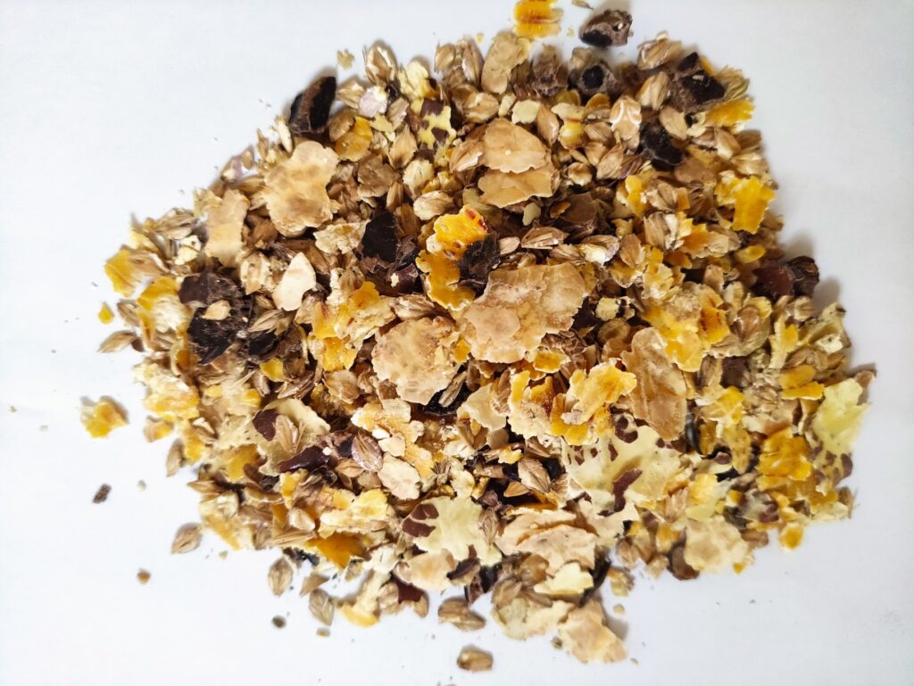 Miscela di cereali e proteici fioccati composta da fiocco di mais, fave laminate, fiocco di orzo integrale, carrube frante, fiocco di pisello, fiocco di soia.