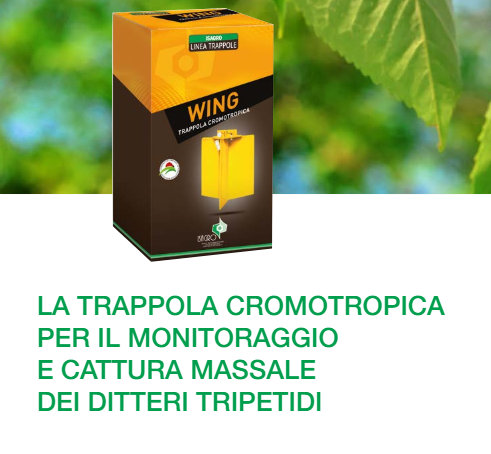 ISATRAP WING è una trappola cromotropica adesiva, il cui colore giallo svolge un’azione di attrazione dell’insetto bersaglio, particolarmente attiva nei confronti di Ditteri Tripetidi.