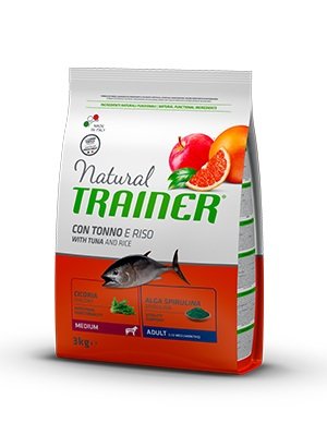 TRAINER NATURAL ADULT MEDIUM KG 3 TONNO Deliziose crocchette della linea Natural Trainer Adult Medium Tonno e Riso. La specifica miscela prebiotica con estratto di Cicoria, FOS e MOS favorisce il nutrimento e il corretto sviluppo del microbiota intestinale. La naturale azione rivitalizzante e rigenerante dei principi nutritivi dell’Alga spirulina aiuta a supportare la vitalità dell’organismo. I peptidi bioattivi del collagene favoriscono il mantenimento della corretta funzionalità articolare. Lalimento secco Trainer Natural garantisce sppetibilità e digeribilità grazie al valore nutrizionale della carne fresca di pollo e tacchino 100% italiana, disossata e non congelata. Natural Trainer Adult Medium con tonno caratteristiche: - crocchette per cani di taglia media - con carne fresca italiana - ricche di ingredienti di ottima qualità - per il benessere per tratto intestinale - per il benessere delle articolazioni Proteine disidratate di pollo e tacchino , granturco , pollo fresco , fioretto di granturco , riso 10% , grasso di origine animale , tonno 4% , proteine animali idrolizzate , semi di lino* , polpa di barbabietola* 2,4% , proteine disidratate di tonno , olio di granturco , lievito autolisato 0,75% , estratto secco di radici di cicoria (fonte di inulina)* 0,7% , sostanze minerali , lignocellulosa , mela disidratata in polvere* 0,15% , concentrato di limone in polvere* 0,1% , spirulina (Arthrospira platensis)* 0,1%. , *Ingredienti di origine naturale specifica. ADDITIVI NUTRIZIONALI: vitamina A 26000 UI, vitamina D₃ 1350 UI, vitamina E 355 mg, solfato di rame(II) pentaidrato 49,13 mg (rame: 12,5 mg), carbonato di ferro(II) 310,5 mg (ferro 150 mg), iodato di calcio anidro in granuli rivestiti 3,85 mg (iodio 2,5 mg), selenito di sodio 0,44 mg (selenio 0,2 mg), ossido di zinco 193,4 mg (zinco 156 mg), ossido di manganese (II) 45,1 mg (manganese 35 mg)., Additivi tecnologici: clinoptilolite di origine sedimentaria 4000 mg. proteina grezza 26%, grassi grezzi 16%, fibre grezze 2,5%, ceneri grezze 6,5%, Omega-3 0,85%, Omega-6 3%.