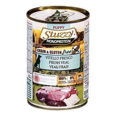 STUZZY DOG MONOPROTEICO PUPPY VITELLO Alimento bilanciato per cuccioli sensibili e con intolleranze alimentari. Senza cereali e senza glutine. Ricetta appetitosa e molto digeribile, ricca di vitamine e minerali. Paté con alta percentuale di materia prima di qualità, con pezzi selezionati. Ricetta monoproteica, grain & gluten free, altamente digeribile, priva di coloranti e conservanti aggiunti, adatta ai soggetti cui è stato prescritto un regime alimentare ad eliminazione. Per cani cuccioli Composizione: vitello fresco 70%, brodo di vitello 28,9%, sostanze minerali 1%, olio di semi di lino 0,1%. Addittivi nutrizionali/kg: Vit. D3 200 U.I., solfato di zinco, monoidrato 15 mg, solfato manganoso, monoidrato 3 mg, iodato di calcio, anidro 0,75 mg, Vit. E 30 mg, Vit. C 40 mg, Vit. B1 13 mg, Vit. B2 6 mg, Vit. B6 3 mg, Vit. B12 75 μg, Vit. B3 17 mg, Vit. B5 12 mg, Vit. B9 0,6 mg, Biotina 300 μg. Componenti analitici e kcal/kg: proteina 10,5%, fibra grezza 0,5%, oli e grassi grezzi 6,8%, ceneri grezze 2,5%, umidità 75%, calcio 25%.