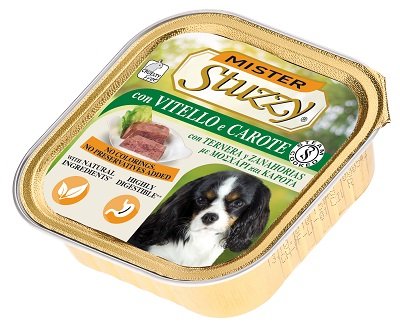 DESCRIZIONE PRODOTTO: Non solo paté, ma carni selezionate e presentate in veri pezzi, cotti a vapore senza aggiunta di coloranti e conservanti. COMPOSIZIONE: carni e derivati 60% (vitello 16%) ortaggi (carote 6%) sottoprodotti di origine vegetale sostanze minerali ADDITIVI/KG (ADDITIVI NUTRIZIONALI): Vit. D3 80 U.I., Vit. E 20 mg, solfato di zinco monoidrato 13,5 mg, solfato di manganese monoidrato 4,6 mg, ioduro di potassio 0,6 mg (di cui iodio 0,5 mg) COMPONENTI ANALITICI: proteina 9% fibra grezza 0,4% tenore in materia grassa 5% ceneri grezze 2% umidità 82% 84 Kcal/100g