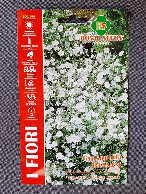 GYPSOPHILA BIANCA VELO DI SPOSA Varietà tradizionale per il giardino domestico solitamente usata come fiore reciso o da disidratare. Cresce sino a 70/80 cm. con un bel cespuglio rigoglioso. E’ adatta per sole o mezz’ombra. Richiede cure limitate con irrigazioni leggere e non troppo ravvicinate. Si semina in primavera per fioritura estiva oppure al sud in estate autunno per fioritura primaverile. I semi vanno coperti con un leggero strato di torba. Le piantine vanno trapiantate con adeguato pane di terra dopo 5/6 settimane dalla semina.