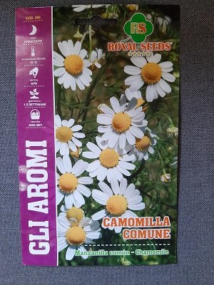 CAMOMILLA COMUNE RS Pianta erbacea annuale, si usa comunemente in infuso, ha proprietà sedative, antinfiammatorie, eupeptiche. Ha ottima adattabilità ambientale è una pianta rustica. Si semina ad aprile per una raccolta agosto/settembre.