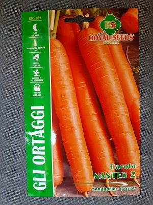 CAROTA NANTES 2 RS Bella selezione medio precoce del tipo nantese, fogliame alto e robusto, radice di formazione cilindrica della lunghezza di 18-20 cm. Il colore arancio è molto bello ed intenso. Il cuore è tenero e croccante. Si semina a spaglio o a file distanti tra loro cm 30 e cm 2/3 sulla fila nel periodo da febbraio a luglio.
