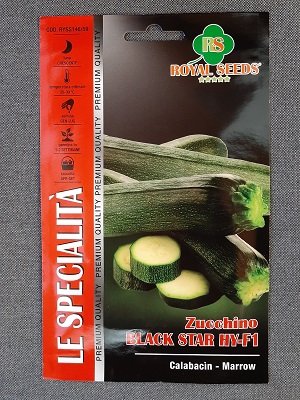 BUSTA ZUCCHINO BLACK STAR HY-F1 RYSS Varietà precoce. Pianta a portamento eretto ed aperto che facilità la raccolta dei frutti che sono di colore verde scuro brillante e di forma cilindrica. La produzione uniforme, elevata e di lunga durata nel tempo. Le piante sono generalmente molto sane grazie alla buona resistenza a virus e oidio. Indicato sia per coltura in serra che in pieno campo.