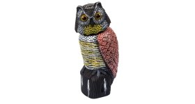 Aallontana gli uccelli da alberi, frutteti e vigneti. Ha occhi riflettenti. La testa gira grazie al vento, la base può essere riempita con sabbia o ghiaia per dare piu stabilità oppure il può essre tolto per fissare il gufo ad un palo.