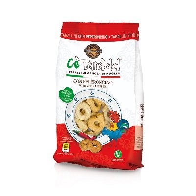 TARALLINI CE TARADD PEPERONCINO GR 225 Farina di GRANO tenero, olio di oliva, vino bianco, olio extravergine di oliva 2%, sale, peperoncino macinato 0,4%. Può contenere tracce di SESAMO, SOIA, SENAPE e LATTE.
