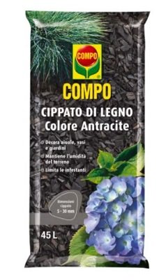 COMPO CIPPATO ANTRACITE LT 45 Decora aiuole, vasi e giardini Mantiene lumidità del terreno Limita le infestanti Descrizione del prodotto Pacciamante decorativo per aiuole, sentieri e spazi gioco. Previene la crescita delle erbe infestanti, tenendo cosi pulite le aree limitrofe a cespugli, arbusti, alberi a piante fiorite. In inverno protegge le piante dal gelo favorendo la ripresa in primavera in estate trattiene lacqua nel suolo, mantenendo lumidità e limitando cosi la richiesta di annaffiature. Cippati di legno di conifere scuriti da coloranti minerali.