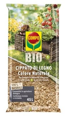 COMPO CIPPATO NATURALE LT 45 Cippato di legno di alta qualità ideale per decorare giardini, bordure, aiuole o come strato di base di un orto rialzato. Oltre a decorare, limita la crescita delle infestanti, mantiene lumidità del suolo, protegge e radici da freddo e limita la compattazione del terreno. Utilizzato come strato di fondo di orti e aiuole riazate funge drenante e crea un ambiente areato, eviando i pericolosi ristagni dacqua dannosi per le radici. Impiego Raccomandazioni per luso Per la realizzazione di orti rialzati: se realizzato in terra, posizionare una grata metallica sul fondo per impedire l’accesso dal basso di talpe, roditori e altri ospiti indesiderati. Disporre uno strato di fondo di COMPO Cippato di legno alto circa il 30 %-40% dell’altezza dell’orto rialzato pressare bene COMPO Cippato di Legno durante il riempimento per migliore stabilità e aerazione. Come strato disporre COMPO BIO Compost (30-40% dell’altezza) per l’ultimo strato , riempire con COMPO BIO Terriccio per Orto rialzato. Come decorativo pacciamante: applicare uno strato con uno spessore minimo di 4 cm. Per limitare la crescita delle infestanti sul lungo periodo, potrebbe essere necessario applicare uno strato di maggior spessore. Tuttavia, fate attenzione a non esagerare poiché uno strato troppo spesso (> 12 cm) potrebbe trattenere troppa umidità nel suolo. L’applicazione annuale di un nuovo strato di COMPO Cippato di Legno vi consente di continuare ad approfittare dei vantaggi di questa pacciamatura.