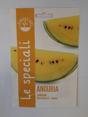 BUSTA SPECIALE ANGURIA JANOSIK Varietà precoce. Pianta vigorosa e di buona produzione con frutto rotondo, buccia sottile di colore verde. Polpa di colore giallo intenso molto zuccherina e tenera.