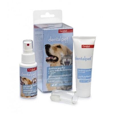 DENTALPET KIT DENTIFRICIO+ SPRAY DENTALE Descrizione Candioli Dentalpet Kit Nuovo, tutto ciò che serve per gestire in modo completo le pratiche relative all’igiene orale del cane e del gatto. Caratteristiche Indicazioni: DentalPet® è un dentifricio specifico per cani e gatti ad elevata adesività. I suoi principi attivi (Zinco citrato, Triclosan, estratto di Ginkgo biloba, estratto di Malva sylvestris e Monofluorofosfato di sodio) lo rendono ideale per l’igiene orale quotidiana dei piccoli animali, agisce infatti come lenitivo ed emolliente sulle gengive, rinforza lo smalto dei denti e potenzia le naturali difese del cavo orale. Il suo utilizzo continuativo costituisce un efficace strumento per prevenire l’insorgenza di infiammazioni e rappresenta un valido metodo per il controllo dell’alitosi. DentalPet® Spray è un collutorio per cani e gatti che, grazie alla sua formulazione priva di alcool e al contenuto delle sostanze attive, svolge varie attività benefiche nei confronti dei denti e del cavo orale: inibisce lo sviluppo della placca batterica, lenisce le gengive infiammate, rinforza lo smalto dei denti, potenzia le naturali difese della bocca e contribuisce ad un efficace controllo dell’alitosi. Modalità di applicazione Applicare DentalPet® sui denti e sulle gengive dell’animale e frizionare delicatamente per circa 1 minuto, mediante l’apposito ditale per ottenere i migliori risultati, oppure aiutandosi con un dito o uno spazzolino. Ripetere l’applicazione una volta al giorno. DentalPet® Spray Nebulizzare una volta al giorno su denti e gengive. È consigliabile non superare un’applicazione di 21 giorni consecutivi. I cicli di applicazione possono essere ripetuti più volte secondo il giudizio del Medico Veterinario.