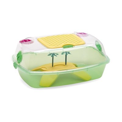 TARTARUGHIERA DAFNE BEACH VERDE TRASPARENTE Dafne Beach è una vaschetta per tartarughe chiusa, in plastica verde trasparente per osservare sempre le attività di questi piccoli animaletti. Dotata di coperchio per evitare la fuga dell’animale e di apertura con fori nella parte superiore per garantire una perfetta areazione e poter accedere alla vaschetta per inserire il cibo comodamente. Il coperchio è facilmente rimovibile grazie ai due ganci laterali per effettuare la pulizia completa della vasca. L’isolotto con palme completa questa tartarughera fornendo un habitat perfetto per accogliere le tue tartarughe.