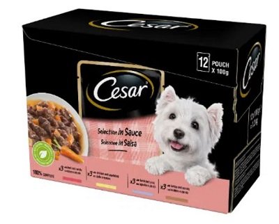 CESAR SELEZIONE IN SALSA 12X100 GR Cesar Multipack Selezione Salsa sono appetitosi bocconcini di manzo, pollo, agnello e tacchino in salsa cucinati al vapore, accompagnati da verdure per deliziare il tuo amico a quattro zampe fornendogli un pasto umido completo e bilanciato con un gusto autentico e raffinato. Cesar Selezione in salsa contiene 12 pratiche buste monoporzione da 100gr in due varietà, per offrire al tuo cane un pasto completo di proteine, vitamine e minerali con un gusto eccezionale. Tutte le ricette Cesar sono senza zuccheri aggiunti e aromi artificiali. Composizione manzo e carote: carni e derivati (44%, naturale* 92%, di cui manzo 4%), cereali, verdure (di cui carote essiccate 0.5%, equivalente a carote 4%), sostanze minerali, sottoprodotti di origine vegetale. *ingredienti naturali. Composizione pollo e verdure: carni e derivati (44%, naturale* 92%, di cui pollo 4%), cereali, verdure (di cui mix di carote e piselli essiccati 0.8%, equivalente a un mix di carote e piselli 4%), sostanze minerali, sottoprodotti di origine vegetale. *ingredienti naturali. Composizione agnello e piselli: carni e derivati (44%, naturale* 92%, di cui agnello 4%), cereali, verdure (di cui piselli essiccati 1.2%, equivalente a piselli 4%), sostanze minerali, sottoprodotti di origine vegetale. *ingredienti naturali. Composizione tacchino e carote: carni e derivati (44%, naturale* 92%, di cui tacchino 4%), cereali, verdure (di cui carote essiccate 0.5%, equivalente a carote 4%), sostanze minerali, sottoprodotti di origine vegetale. *ingredienti naturali. Componenti analitici (%): proteina grezza: 8.5 oli e grassi grezzi: 5.0 ceneri grezze: 2.1 fibra grezza: 0.50 umidità: 81.0. Integrazioni per kg: Additivi nutrizionali: Vitamina D₃: 250 U.I., Rame (Solfato di rame(II) pentaidrato): 1.3 mg, Iodio (iodato di calcio, anidro): 0.28 mg, Ferro (solfato di ferro (II) monoidrato): 3.6 mg, Manganese (solfato manganoso, monoidrato): 2.2 mg, Zinco (solfato di zinco, monoidrato): 19.4 mg.