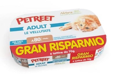 PETREET NATURA VELLUTATA VITELLO 6X70 GR Petreet Gatto Multipack Vellutate Vitello è un alimento umido per gatti, al delizioso gusto di Vitello che offre tutta la nutrizione di cui ha bisogno il tuo micio. Se hai notato che il tuo micio ha difficoltà a masticare, i nutrizionisti e Veterinari di Petreet hanno sviluppato le Velllutate per permettere al tuo amico felino di tornare a mangiare senza fatica e a concentrarsi sul gusto. Alimento composto da: Carne di vitello 28%, petto di pollo 11%, proteine animali idrolizzate, farina di riso 1,6%, estratto di pesce. Nel conveniente multipack 5+1 con lattine da 70 G, Petreet Gatto Multipack Vellutate Vitello è adatto per tutti i gatti adulti. Il prodotto è da servire a temperatura ambiente, lasciando sempre a disposizione acqua fresca e pulita. Per lalimentazione di un gatto adulto, di peso medio ed in attività normale, servire una lattina al giorno per ogni kg di peso. Carne di vitello 28%, petto di pollo 11%, proteine animali idrolizzate, farina di riso 1,6%, estratto di pesce. Vitamina A 666 I.U./kg - Vitamina D3 50 I.U./kg - Vitamina E 20 I.U./kg. Umidità 92%, Proteina grezza 6%, Fibra grezza 1%, Oli e grassi grezzi 0,2%, Ceneri grezze 2%.