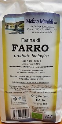 FARINA DI FARRO BIO KG 1 Farina ottenuta dalla macinazione di farro spelta da agricoltura biologica. Puo essere utilizzata in purezza o miscelata ad altri cereali per la realizzazione di pasta, pane e prodotti da forno. Rappresenta una valida alternativa al frumento. Consigli di utilizzo : la farina di farro può essere utilizzata per tutte le preparazioni, dolci o salate, sia da sola che mescolata con altre farine. Indicazioni per la conservazione : tenere in luogo fresco e asciutto, al riparo dai raggi solari.