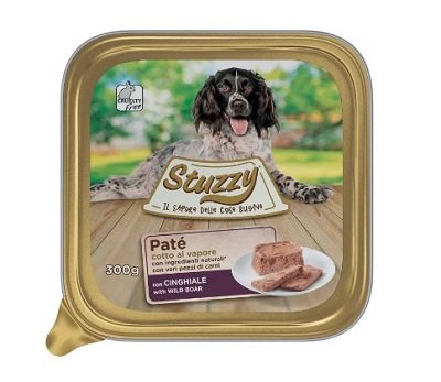 STUZZY DOG PATE CINGHIALE GR.300 Cibo umido per cani adulti in vaschetta da 300g di Stuzzy, un goloso patè con veri pezzi di carne per lalimentazione completa del tuo amico a quattro zampe. Le diverse ricette proposte sono prive di coloranti e conservanti aggiunti per garantire al tuo amico a quattro zampe unalimentazione ottimale. Prodotto con alta percentuale di carni e cotto al vapore. Il tuo cane non vedrà lora di assaggiarlo! Cinghiale: cinghiale* 68%, more* 2%, sostanze minerali 1%, erbe provenzali* 0,1%, olio di semi di lino* 0,1%. Additivi/kg: Additivi nutrizionali: Vit. D3 200 U.I., Zn (solfato di zinco monoidrato) 25 mg, Mn (solfato di manganese monoidrato) 1,4 mg, I (iodato di calcio anidro) 0,75 mg, Cu (solfato di rame(II)pentaidrato) 0,5 mg, proteina 10,3%, grassi grezzi 6,4%, ceneri grezze 2,5%, fibre grezze 0,5%. Umidità 77%