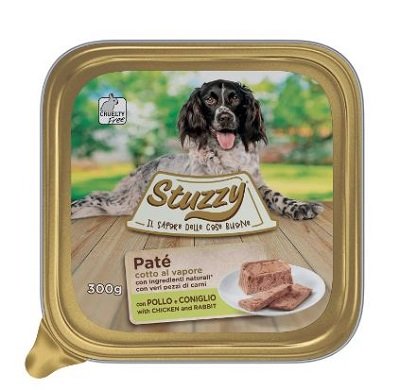 STUZZY DOG PATE POLLO E CONIGLIO GR.300 Cibo umido per cani adulti in vaschetta da 300g di Stuzzy, un goloso patè con veri pezzi di carne per lalimentazione completa del tuo amico a quattro zampe. Le diverse ricette proposte sono prive di coloranti e conservanti aggiunti per garantire al tuo amico a quattro zampe unalimentazione ottimale. Prodotto con alta percentuale di carni e cotto al vapore. Il tuo cane non vedrà lora di assaggiarlo! carni e derivati 65% (pollo 16% coniglio 16%) sottoprodotti di origine vegetale sostanze minerali Additivi/kg (additivi nutrizionali): Vit. D3 80 U.I., Vit. E 20 mg, solfato di zinco monoidrato 13,5 mg, solfato di manganese monoidrato 4,6 mg, ioduro di potassio 0,6 mg (di cui iodio 0,5 mg) Componenti analitici: proteina 9% fibra grezza 0,4% tenore in materia grassa 5% ceneri grezze 2% umidità 82% 84 Kcal/100g.