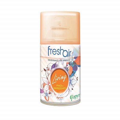 FRESH AIR LIVING AGRUMI ML 250 FRESH AIR LIVING AGRUMI è un deodorante aerosol per applicazione con erogatore automatico COPYR, in ambienti interni. FRESH AIR LIVING AGRUMI è un deodorante studiato per l’impiego ambienti interni, ad uso professionale. Grazie alla elevata concentrazione di essenze pregiate ed alla speciale valvola ad erogazione dosata, FRESH AIR LIVING deodora perfettamente ambienti fino a 100 m3. La bombola garantisce 3.000 erogazioni circa. Dona freschezza ai tuoi ambienti con FRESH AIR LIVING AGRUMI e vivili in libertà.