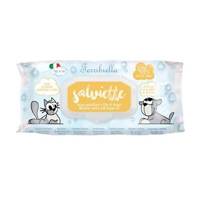 SALVIETTE ACQUA MICELLARE-ARGAN PZ 40 Le salviette detergenti per cani e gatti Ferribiella Acqua Micellare e Olio di Argan rappresentano un ottimo sistema per igienizzare efficacemente il manto di Fido e Micio. Perfette per consentire ligiene dei nostri quattro zampe anche quando l’uso dell’acqua non è possibile o non è consigliato, puliscono dolcemente le zampe, il musetto e le parti delicate, eliminandone i cattivi odori. La loro formula è ideale per creare un perfetto effetto "seta" al pelo dei quattro zampe. Le salviette detergenti per cani e gatti Ferribiella sono ideali sia in casa che in viaggio e quando non è possibile utilizzare lacqua, per pulire efficacemente il peloso e se necessario per neutralizzare il cattivo odore del manto. Senza alcol, coloranti, parabeni e sodio laurilsolfato (SLS), la loro morbidezza e la loro particolare detersione puliscono in profondità donando lucentezza al mantoil manto. Perfette anche per ravvivare i manti opachi. LAZIENDA Ferribiella azienda italiana a conduzione familiare nata nel 1980 è una realtà italiana nata dal grande amore per gli animali e il loro comfort. Ferribiella offre prodotti per animali pensati per il loro benessere e la loro sicurezza con lutilizzo di materiali di prima scelta ed un attento studio delle loro esigenze. Tutti gli accessori per cani e gatti Ferribiella sono concepiti per essere amici dellambiente e degli animali. LE SALVIETTINE FERRIBIELLA ACQUA MICELLARE E OLIO DI ARGAN SI DISTINGUONO PER: Salviette detergenti profumate per cani e gatti Adatto anche per cuccioli, animali anziani o convalescenti e femmine in gravidanza e allattamento Profumazione con acqua micelleare e olio di argan Profonda detersione Rendono il manto lucido e lo rinfrescano Rispettano il ph fisiologico del manto Prive di SLS, coloranti e alcol Made in Italy Cruelty Free Pratica confezione apri e chiudi da 40pz , salviette di misura 32x17cm