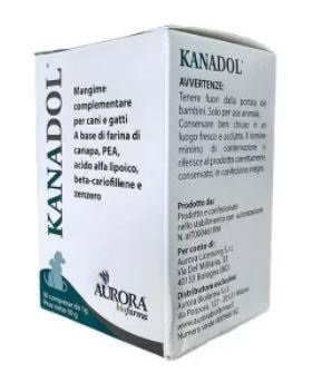 KANADOL 30 COMPRESSE KANADOL: mangime complementare per cani e gatti utile per la normale funzione del sistema nocicettivo e del sistema endocannabinoide. Kanadol , a base di farina di canapa, PEA, acido alfa lipoico, beta cariofillene e zenzero rappresenta un valido supporto per il sostegno della funzionalità del sistema nocicettivo del cane e del gatto da addizionare alla normale alimentazione quotidiana. Mantenere la normale e fisiologica funzionalità del sistema nocicettivo risulta fondamentale per il benessere completo dell’animale. A BASE DI Farina di canapa, PEA, acido alfa lipoico, beta cariofillene e zenzero.