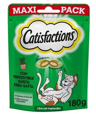 CATISFACTIONS ERBA GATTA 180 G Lo snack Catisfactions è un prelibato spuntino adatto sia ai gatti che ai gattini, con una consistenza unica: il gustosissimo ripieno racchiuso in un croccante confetto farà leccare i baffi al tuo gatto! Perfetto come ricompensa o come spuntino fuori pasto, in tante varianti di gusto per soddisfare tutti i palati e non annoiare mai il tuo micio. Uno snack delizioso e irresistibile di cui il tuo gatto non potrà più fare a meno: provalo!