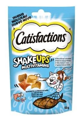 CATISFACTIONS SHAKEUPS FRUTTI DI MARE GR 55 Snack per gatti con esterno croccante e ripieno morbido. Cereali, carni e derivati, oli e grassi, estratti di proteine vegetali, sostanze minerali, sottoprodotti di origine vegetale Proteina grezza 22%, oli e grassi grezzi 22%, ceneri grezze 8%, fibra grezza 1.5%, Valore energetico 414 kcal/100g Additivi nutrizionali: Vitamina A 1293 U.I., Vitamina B1 9.9 mg, Vitamina B2 16.9 mg, Vitamina B6 4.4 mg, Vitamina D3 143 U.I., Vitamina E 115 mg, Rame (solfato di rame (II) pentaidrato) 6.1mg, Iodio (ioduro di potassio) 1.5mg, Manganese (solfato manganoso, monoidrato) 14.1mg, Zinco (solfato di zinco, monoidrato) 70.5mg. Additivi sensoriali: gusto Tonno 2.6mg, gusto Salmone 0.13mg, gusto Gamberetti 0.13mg