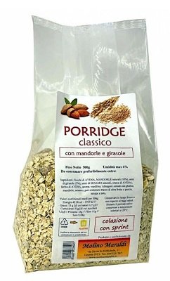 PORRIDGE CLASSICO GR 500 Lavena è il cereale, prezioso per la salute, alla base del tradizionale PORRIDGE inglese, fondamento della prima colazione britannica. Il PORRIDGE CLASSICO è composto da fiocchi di avena, crusca di avena e farina di avena, cui si aggiungono mandorle e semi. Si prepara aggiungendo latte caldo e lasciando in infusione qualche minuto. Ingredienti fiocchi di avena, mandorle naturali (10%), semi di girasole (5%), semi di sesamo naturali, crusca di avena, farina di avena, aroma vanillina Allergeni cereali con glutine, mandorle, sesamo possibili tracce di altra frutta a guscio, senape, soia Consigli di utilizzo aggiungere latte caldo (o freddo) e lasciare in infusione qualche minuto Conservazione conservare in luogo fresco e asciutto