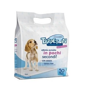 TAPPET IN 60X60 BAG.DA 50 PZ. TAPPET-IN Tappet In è un tappetino multistrato di alta qualità, ultra-assorbente e anti-odore, in grado di risolvere il problema igienico causato dai cuccioli addestrati in casa. Il primo strato, realizzato a griglia, permette la diffusione omogenea del liquido, è filtrante e garantisce un effetto asciutto immediato. Il secondo strato, grazie alla realizzazione in cellulosa e in speciali polimeri super-assorbenti, assicura un’efficace azione assorbente e allo stesso tempo antibatterica, riducendo la proliferazione di batteri e l’insorgenza di cattivi odori. In questo strato i liquidi vengono assorbiti e trattenuti definitivamente. Infine lultimo strato, impermeabile, mantiene la superficie sottostante perfettamente asciutta. Gli speciali strip adesivi consentono di mantenere il tappeto sempre in posizione, mentre i 4 cm di bordo evitano fuoriuscite e facilitano la dismissione del prodotto. Ideale in casa come in viaggio, Tappet In può essere utilizzato anche come fondo per cucce e trasportini. Tappet in è un prodotto di qualità superiore, realizzato con assorbente contenente uno speciale polimero 3G SAP proveniente dal Giappone. La capacità di assorbimento di tappet-in è fino a tre volte superiore ad altri prodotti analoghi.
