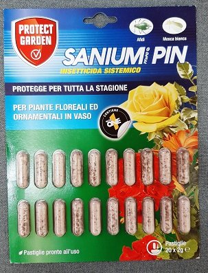 SANIUM PIN PFNPO 20 X 2 GR PROTECT GARDEN Insetticida sistemico in pastiglie Protect Garden Sanium Pin è il pratico e comodo insetticida sistemico pronto alluso in pastiglie da applicare direttamente nel terreno. Il principio attivo viene assorbito tramite le radici della pianta e risulta efficace verso gli insetti come Afidi e Mosca bianca. La formulazione è arricchita con concime ONE per nutrire e proteggere le piante fino per tutta la stagione. Applicare il prodotto alla prima comparsa degli insetti Nutre e Protegge Per piante floreali e ornamentali INSETTICIDA SISTEMICO Il principio attivo di Sanium Pin viene assorbito dalle radici movendosi dalla parte inferiore quella superiore della pianta e passando da una parte allaltra delle foglie. Questa caratteristica è importante per andare a colpire afidi e mosca bianca che spesso si nascondono nelle parti della pianta più difficili da raggiungere con insetticidi spray