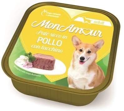 Monamoour Adult Paté per cani con pollo e tacchino da 300gr e 150gr è un alimento completo per cani adulti. Ricetta senza glutine e senza cereali. Mangime completo per animali da compagnia. Composizione Carni e derivati (contenuto di carni 61%, di cui pollo 14% tacchino 4%), pesci e sottoprodotti dei pesci, sostanze minerali. Additivi Vitamina D3140 UI, solfato di zinco monoidrato 33 mg (zinco 12 mg), ossido manganoso 1,6 mg (manganese 1 mg), solfato rameico pentaidrato 2 mg (rame 0,5 mg), iodato di calcio anidro 0,6 mg (iodio 0,3 mg) (valori per kg. di prodotto). Componenti analitici Umidità 82,0%, proteina grezza 9,5%, grassi grezzi 5,5%, ceneri grezze 2,2%, fibre grezze 0,3%. Istruzioni per un uso corretto Razione giornaliera consigliata: 40/50 grammi di prodotto per kg. di peso corporeo dell’animale. la quantità può essere modificata a seconda della razza, dell’età dell’animale, o dell’attività fisica. Servire a temperatura ambiente. Non somministrare all’animale il prodotto troppo freddo. Lasciare sempre a disposizione dell’animale acqua fresca e pulita. Dopo l’apertura conservare in frigorifero.