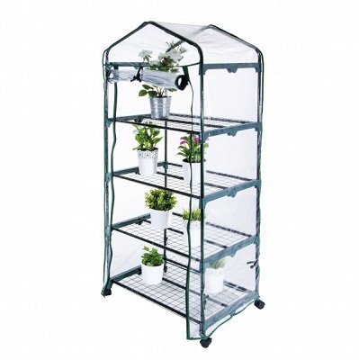SERRA 4 RIPIANI C/RUOTE 69X49XH.163CM Serra a quattro ripiani con ruote o senza. Struttura in metallo verniciato e parti di raccordo in materiale plastico. Facile da spostare. Telo in PVC trasparente con apertura frontale con cerniera.