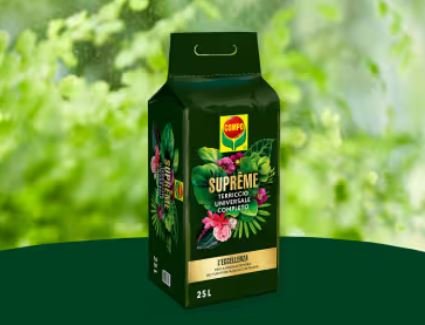 SUPREME L 25 TERRICCIO UNIVERSALE COMPLETO COMPO Fornire concime è un gesto d’amore: e quando il nutrimento è “il meglio”, la certezza di curare le piante con passione si accompagna al piacere di garantire le migliori condizioni per crescere bene. Questi sono i principi-guida che hanno portato a sviluppare la nuova gamma COMPO Suprême. Perché COMPO Suprême? Versatilità: una gamma completa per ogni tipo di pianta. Semplicità: coltivare piante rigogliose non richiede competenze da esperto. Innovazione: formule avanzate per una crescita sana e forte. Sostenibilità: packaging riciclati e soluzioni eco-friendly. Qualità garantita: oltre 60 anni di esperienza per risultati impeccabili. Il motto di COMPO Suprême, "Leccellenza per i tuoi fiori e le tue piante", non è solo uno slogan, ma un impegno concreto. I nostri prodotti sono pensati per offrire il meglio alle tue piante, garantendo risultati straordinari. Grazie a una formulazione completa e avanzata, COMPO Suprême si prende cura di ogni tipo di pianta: dai fiori in vaso agli ortaggi, fino alle piante da giardino. Non dovrai più preoccuparti di scegliere prodotti diversi per esigenze specifiche: COMPO Suprême è la soluzione universale, ideale per ogni situazione. Una soluzione per tutte le tipologie di piante COMPO Suprême è stato ideato per rendere la cura delle piante semplice e accessibile a tutti. Che siate alle prime armi o giardinieri esperti alla ricerca di soluzioni pratiche ed efficaci, la nostra gamma è pensata per soddisfare ogni esigenza. Dalla qualità dei substrati ricchi ai concimi granulari e liquidi universali, COMPO Suprême offre tutto ciò che serve per una cura completa e impeccabile. Sia che vi dedichiate al giardinaggio indoor o alla coltivazione in giardino, con COMPO Suprême prendersi cura delle piante diventa un piacere alla portata di tutti. Risparmiare tempo In un mondo frenetico, dove ogni decisione sembra una corsa contro il tempo, la cura delle piante dovrebbe essere un momento di piacere, non di stress. Sia che tu sia un esperto giardiniere o un appassionato alle prime armi, comprendiamo quanto sia importante avere piante sane e rigogliose senza complicazioni. Per questo è nata la linea COMPO Suprême: un’innovazione che unisce semplicità, versatilità e qualità superiore. Con soluzioni efficaci e facili da usare, COMPO Suprême ti permette di dedicarti alla cura delle tue piante con serenità e risultati garantiti. Terriccio Universale Supreme Una pratica e compatta confezione da 25 litri con maniglia, che sta in piedi e occupa poco spazio, per un substrato eccezionale: COMPO Suprême Terriccio Universale completo contiene Turbo radici per favorire lo sviluppo radicale, concime a lenta cessione che garantisce 12 settimane di nutrizione, una composizione ottimale di torbe di alta qualità scure e chiare arricchite con pomice per drenaggio e aerazione e AQUA DEPOT che trattiene acqua per 20 volte il suo peso. Ottimo anche per le piante più esigenti e delicate con radici sensibili, sia da interno che in terrazzo.
