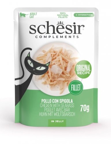 CAT POLLO SPIGOLA JELLY POUCH 70 GR SCHESIR Composizione: - filetti di pollo 75% - spigola 5% - riso 1,5%