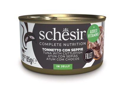 CAT TONNO SEPPIE JEL 85 GR SCHESIR Tonnetto con seppie in gelatina Alimento umido complementare per gatto adulto
