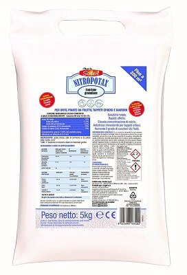 NITROPOTAX CONCIME GRANULARE KG 5 FLEUR DU SOLEIL Concime granulare Concime granulare Nitropotax della linea Fleur du Soleil di Raggio di Sole è un concime minerale a base di Nitropotassa di origine naturale. Con un elevato livello di Azoto, Potassio e Calcio_NK (Ca) 14-23 (13), indispensabile per tutte le colture (ortaggi e frutti) ed in particolare per il pomodoro per prevenire il marciume apicale. Grazie alla sua solubilità totale e alla sua capacità di assorbire l’umidità dal suolo e dall’aria, diventa disponibile molto rapidamente per tutte le colture, funzionando in modo efficace sia nelle condizioni di clima secco che a basse temperature. Concime granulare Nitropax favorisce e incrementa l’idratazione, migliora l’economia dell’acqua e riduce l’appassimento in condizioni di siccità e alte temperature. Inoltre, aumenta il grado zuccherino dei frutti ed è ideale come rinverdente e antistress per i tappeti erbosi.