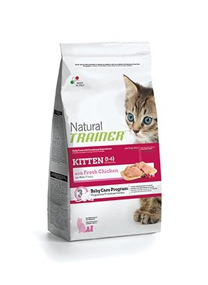 TRAINER NATURAL CAT KITTEN KG.1,5 POLLO Natural Trainer Kitten con pollo crocchette complete ed equilibrate per gattini da 1 a 6 mesi detà. Ideale anche per gatte in gravidanza o in allattamento. Natural Trainer Kitten con salmone supporta il sistema immunitario, favorisce il benessere intestinale, la specifica combinazione di prebiotici (MOS e inulina) favorisce il nutrimento e il giusto equilibrio del microbiota intestinale. Inoltre, i suoi ingredienti naturali aiuta il vostro gattino ad assumere ogni giorno in modo pratico e gustoso i nucleotidi, i prebiotici e gli antiossidanti necessari per sviluppare le sue difese immunitarie e diventare un felino sano e pieno di energia! COMPOSIZIONE: Proteine disidratate di pollo e tacchino , carne fresca di pollo e tacchino (pollo 13,5%) , riso , proteina di granturco , granturco , grassi animali , proteine disidratate di pesce , proteine animali idrolizzate , semi di lino* 2,2% , polpa di barbabietola* , estratto secco di radice di cicoria (fonte di inulina)* 0,7% , fibra di pisello* , sostanze minerali , lievito di birra , MOS (mannanoligosaccaridi)* 0,3% , alga marina (Schizochytrium spp.)* 0,1% , estratto di lievito (nucleotidi)* 0,03% , estratto secco di mirtillo rosso* 0,02% , *Ingredienti specifici di origine naturale Additivi nutrizionali: vitamina A 33.000 UI, vitamina D3 1.920 UI, vitamina E 525 mg, vitamina C 100 mg, taurina 2.100 mg, solfato di rame(II) pentaidrato (rame 6 mg) 23,58 mg, carbonato di ferro(II) (ferro 96 mg) 198,72 mg, iodato di calcio anidro in granuli rivestiti (iodio 0,48 mg) 0,74 mg, selenito di sodio (selenio 0,12 mg) 0,26 mg, ossido di zinco (zinco 90 mg) 111,6 mg, ossido di manganese(II) (manganese 9 mg) 11,6 mg Proteina grezza 36,5%, grassi grezzi 19%, fibra grezza 2%, ceneri grezze 7%, omega 3 1%. COMPONENTI ANALITICI: Umidità 8,00%, Proteina grezza 34,00%, Oli e grassi grezzi 20,00%, Fibra grezza 1,80%, Ceneri grezze 6,90%, Calcio 1,10%, Fosforo 0,95%, Magnesio 0,09%, Acidi Grassi Omega 3 0,60%, Acidi Grassi Omega 6 2,80%. ADDITIVI: Additivi nutrizionali: vitamina A 33.000 UI/kg, vitamina D3 1.920 UI/kg, vitamina E 460 mg/kg, solfato rameico pentaidrato (rame) 12 mg/kg, carbonato ferroso (ferro) 223 mg/kg, iodato di calcio anidro (iodio) 4,8 mg/kg, selenito di sodio (selenio) 12 mg/kg, ossido di zinco (zinco) 120 mg/kg, ossido manganoso (manganese) 14,5 mg/kg, colina cloruro 2.000 mg/kg, taurina 2.000 mg/kg, L-lisina 2.300 mg/kg, DL-metionina 1.000 mg/kg. Additivi organolettici: estratto secco di cicoria (Cichorium intybus) 1.000 mg/kg, estratto secco di mirtillo rosso (Vaccinium macrocarpon) 25 mg/kg.