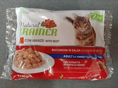 FLOWPACK NATURAL TRAINER CAT BUSTA 4X85G MANZO MANZO Pollame (fresco 4%), maiale, manzo 4%, amido di granturco, fibra di pisello*, sostanze minerali, amido di patate, olio di pesce 0,18%, olio di girasole, destrosio, concentrato secco di mirtilli rossi* 0,01%. *Ingredienti di origine naturale specifica.