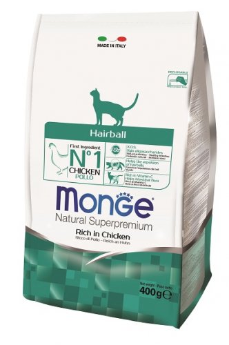 Hairball Ricco di Pollo I croccantini Monge Natural Superpremium Hairball sono un alimento completo per gatti adulti che soffrono più di altri l’accumulo di peli nello stomaco. Garantiscono il benessere del gatto grazie alla presenza di elementi nutritivi di altissima qualità, frutto della ricerca Made in Italy. Il primo ingrediente è il pollo e sono arricchiti con xilo oligossacaridi (X.O.S.), prebiotici naturali che favoriscono la salute dell’intestino. Favoriscono l’espulsione naturale dei boli di pelo e sono ricchi di vitamina C che aiuta la flora intestinale. Pollo (fresco 10%, disidratato 26%), granturco, grasso animale (olio di pollo contenuto in grassi 99,6%, conservato con antiossidanti naturali), riso, polpa di barbabietola, glutine di granturco, proteine animali idrolizzate, farina di uovo intero (ricco in proteine nobili), pesce (salmone disidratato), olio di pesce (olio di salmone), lievito di birra (fonte di M.O.S. e vitamina B12), fibra insolubile di pisello, taurina, X.O.S. (Xylo – oligosaccaridi 3 g/kg), idrolizzato di lievito (M.O.S.), yucca schidigera, rosa canina.