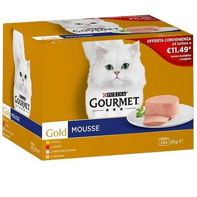 GOURMET GOLD MOUSSE MULTIPACK 24X85G CON PESCE DELLOCEANO: Carni e derivati, Pesci e sottoprodotti dei pesci (di cui pesce delloceano 4%), Sostanze minerali, Sottoprodotti di origine vegetale, Zuccheri. CON POLLO: Carni e derivati (di cui pollo 4%), Sostanze minerali, Sottoprodotti di origine vegetale, Zuccheri. CON MANZO: Carni e derivati (di cui manzo 4%), Sostanze minerali, Sottoprodotti di origine vegetale, Zuccheri. CON TACCHINO: Carni e derivati (di cui tacchino 4%), Sostanze minerali, Sottoprodotti di origine vegetale, Zuccheri.