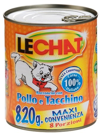 Bocconcini con Pollo e Tacchino Formato: 400 g - 820 g Morbidi e gustosi bocconcini con pollo e tacchino cotti al forno utilizzando solo materie prime di ottima qualità, creati pensando ai nostri piccoli amici. LeChat Classico è una delle linee storiche di Monge continuamente rinnovata ma sempre con un richiamo al passato, il gattino cartoon che zampetta sulla lattina. Carni e derivati 45% (di cui pollo 18%, tacchino 12%), cereali, uova, sali minerali.