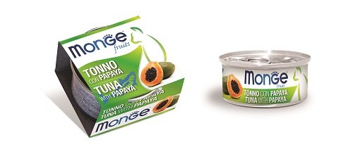 Monge Fruits Tonno con Papaya è un alimento complementare pensato per i gatti più raffinati ed esigenti che completa la gamma Monge Natural Superpremium, una linea completamente dedicata all’alimentazione naturale. La ricetta è a base di delizioso tonno arricchito con papaya per garantire un equilibrato apporto di vitamine naturali e F.O.S. (frutto-oligosaccaridi). Tutte le materie prime e gli ingredienti utilizzati sono selezionati e soggetti a rigorosi controlli durante il processo di produzione, la frutta non è trattata chimicamente e non sono utilizzati né conservanti né coloranti. Grazie alla cottura al vapore è ancora più saporito, gustoso e appetibile. Tonno (Katsuwonus pelamis) 55%, papaya 5%, riso, F.O.S. (frutto-oligosaccaridi) 400 mg/Kg.