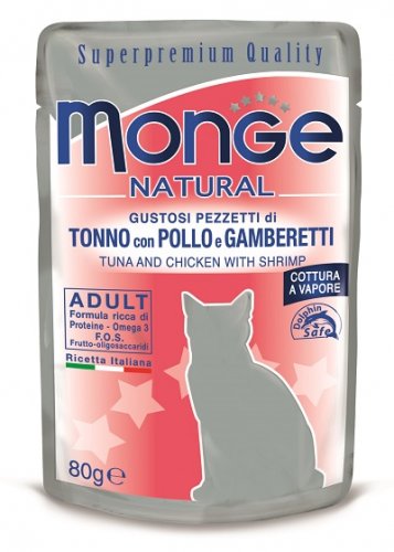 Alimento complementare per gatti adulti con deliziosi pezzetti di tonno con pollo e gamberetti, cotto al vapore, prodotto in Thailandia, con le tipiche caratteristiche del prodotto di alta qualità a base pesce: alta appetibilità grazie all’uso di ingredienti freschi e buon contenuto nutritivo. E’ ricco di Omega 3 e di proteine e ha un basso contenuto di grassi. Aiuta il gatto a mantenersi in buona forma e con un buon livello di energia. Tonno 25%, pollo 20%, gamberetti 5%, riso, FOS (frutto-oligosaccaridi) 400 mg/kg.