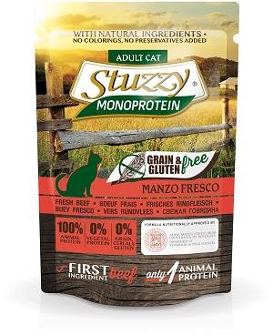 STUZZYCAT MONOPROTEICO G 85 MANZO Il cibo umido per gatto Stuzzy Monoprotein Grain e Gluten Free é un alimento bilanciato ideale per lalimentazione quotidiana del tuo amico tigrotto. Creato mediante lutilizzo di ununica proteina animale e privo di carboidrati e glutine. 70% manzo fresco, 28,9% brodo di manzo, 1% sostanze minerali, 0,1% olio di semi di lino.