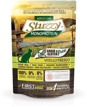 STUZZYCAT MONOPROTEICO G 85 VITELLO Il cibo umido per gatto Stuzzy Monoprotein Grain e Gluten Free é un alimento bilanciato ideale per lalimentazione quotidiana del tuo amico tigrotto. Creato mediante lutilizzo di ununica proteina animale e privo di carboidrati e glutine. Vitello Fresco:70% vitello fresco, 28,9% brodo di vitello, 1% sostanze minerali, 0,1% olio di semi di lino