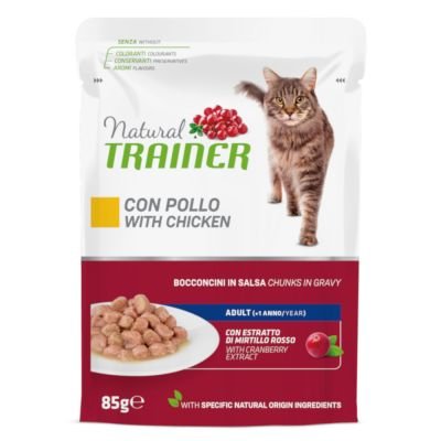 TRAINER NATURAL CAT BUSTA 85 G POLLO Pollo: pollame, carne di maiale, carne di manzo, amido del mais, fibre di piselli*, minerali, amido delle patate, olio di pesce, olio di girasole, glucosio, estratto di mirtillo rosso disidratato*.
