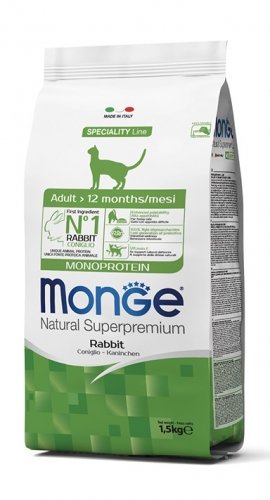 Monge Natural Superpremium Adult Monoprotein Coniglio è un alimento completo e bilanciato per gatti adulti. Formulato per il benessere del tuo gatto grazie alla presenza di elementi nutritivi altamente appetibili e vitamina E a supporto delle difese naturali. Unica fonte proteica animale alternativa è il coniglio, arricchita con Xilo-oligosaccaridi (X.O.S.), ultima generazione di prebiotici per il benessere intestinale. Coniglio (carne fresca 10% e disidratata 26%), riso, glutine di granturco, patate, proteine animali idrolizzate, grasso animale (olio di pollo contenuto in grassi 99,6%, conservato con antiossidanti naturali), polpa di barbabietola essiccata, lievito di birra, fibra di piselli, Xilo-oligosaccaridi (XOS 3 g/kg), mannano oligosaccaridi (MOS), yucca schidigera, rosa canina.