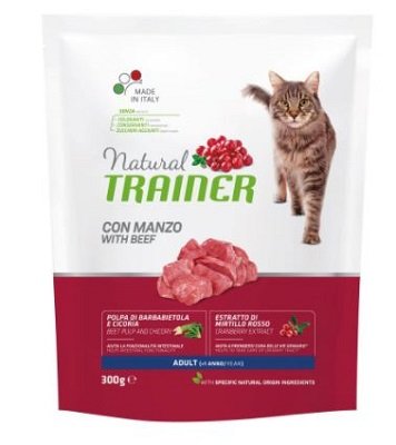 NATURAL TRAINER CAT ADULT MANZO GR 300 Alimento completo ed equilibrato per gatti adulti, da 1 anno di età. Polpa di barbabietola e radice di cicoria aiutano la funzionalità intestinale, lestratto di mirtillo rosso aiuta le vie urinarie. Alimento completo per gatti adulti. I prebiotici di origine naturale, provenienti dall’estratto di radice di cicoria e dalla polpa di barbabietola, aiutano il nutrimento e il corretto equilibrio del microbiota intestinale. Gli estratti di mirtillo rosso e di radice di cicoria di origine naturale e i livelli controllati di minerali aiutano a prendersi cura delle vie urinarie. COMPOSIZIONE:Carne fresca di pollo e tacchino, granturco, proteine disidratate di manzo 12%, proteine disidratate di pollo e tacchino, fioretto di granturco, proteina di granturco, riso, grassi animali, polpa di barbabietola* 2,5%, proteine animali idrolizzate, semi di lino*, sostanze minerali, fibra di pisello*, estratto secco di radice di cicoria (fonte di inulina)* 0,7%, lievito di birra, alga marina (Schizochytrium spp.)*, estratto secco di mirtillo rosso* 0,02%, estratto secco di mela AppleZin™* 0,0025%. *Ingredienti specifici di origine naturale. ADDITIVI (per kg): Additivi nutrizionali: vitamina A 27.500 UI, vitamina D3 1.600 UI, vitamina E 510 mg, vitamina C 100 mg, biotina 0,15 mg, taurina 2.000 mg, solfato di rame (II) pentaidrato 19,65 mg (rame 5 mg), carbonato di ferro(II) 165,6 mg (ferro 80 mg), iodato di calcio anidro in granuli rivestiti 0,62 mg (iodio 0,4 mg), selenito di sodio 0,22 mg (selenio 0,1 mg), ossido di zinco 93 mg (zinco 75 mg), ossido di manganese (II) 9,68 mg (manganese 7,5 mg). Additivi zootecnici: cloruro di ammonio 4 g. COMPOSIZIONE ANALITICA: Proteina grezza 33%, grassi grezzi 16%, fibra grezza 2,2%, ceneri grezze 6,7%, omega 3 0,8%, omega 6 3,5%.
