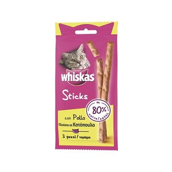 Whiskas Sticks è una gamma pensata per i fuori pasto del tuo gatto, stuzzicante e con una particolare attenzione al suo benessere, disponibilE nelle tre varietà manzo, pollo e salmone. Whiskas Sticks sono golosi stick di carne nutrizionalmente bilanciati, ideali per viziare il tuo gatto tra un pasto e l’altro. Pollo:Carni e derivati (min 80% di cui min 50% pollo), lieviti, zuccheri, sostanze minerali, pesci e sottoprodotti dei pesci, cereali, oli e grassi, erba aromatica.