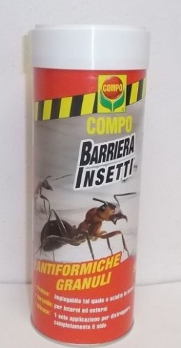 COMPO ESCA ANTIFORMICHE ATTRATTIVA GR.500 COMPO Anti Formiche Granuli Esca in granuli solubili Biocida con doppia applicazione: sia tal quale che sciolto in acqua Utilizzabile sia in ambienti interni che esterni Una sola applicazione distrugge il nido In barattolo spargitore Descrizione del prodotto COMPO Antiformiche Granuli è unesca in granuli solubili, non polverulenti, a base di zucchero. Le formiche (formica nera/formica da giardino Lasius niger, formiche adulte) vengono eliminate velocemente da percorsi, piazzole, terrazze, locali di deposito (escluse dispense), garage, capannoni, camere vuote o simili grazie al buon effetto attrattivo del prodotto. La doppia possibilità di applicazione - distribuzione a spaglio e irrorazione - garantisce unefficacia ottimale anche in condizioni sfavorevoli. Il prodotto è provvisto di una buona solubilità in acqua e biodegradabilità. Laggiunta di un agente amaricante ne impedisce lingestione accidentale da parte dei bambini. Impiego Raccomandazioni per luso Utilizzare esclusivamente in ambienti che non vengono a contatto con acqua, ossia non sono esposti a pioggia e inondazioni. Non applicare in ambienti che vengono regolarmente puliti con luso di acqua. Per evitare avvelenamenti, il prodotto deve essere utilizzato esclusivamente laddove sia possibile evitare il contatto con animali, anche domestici o selvatici, e bambini. Lavare con acqua le superfici contaminate dal prodotto o da residui di prodotto. Utilizzare panni monouso inumiditi da smaltire successivamente tra i rifiuti solidi.