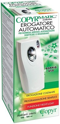 COPYRMATIC EVOLUTION NIGHT&DAY Erogatore automatico professionale, totalmente programmabile, per bombole aerosol a svuotamento temporizzato Design moderno e discreto che si adatta ad ogni ambiente Estremamente silenzioso, una volta posizionato e messo in funzione non richiede alcun ulteriore intervento Le speciali bombole con valvola a dosaggio vengono azionate dall’apparecchio rilasciando una quantità predefinita di prodotto (insetticida, deodorante o desodorizzante) che, diffondendosi nel locale, controlla le infestazioni da insetti volanti Dotato di programmi day, night, night&day con intervallo di erogazione 7.5, 15 e 30 min (15min per gli insetticidi) Funzionamento a batterie (2 pile mezza torcia “C”) non in dotazione. Bloccabile con chiave (in dotazione)
